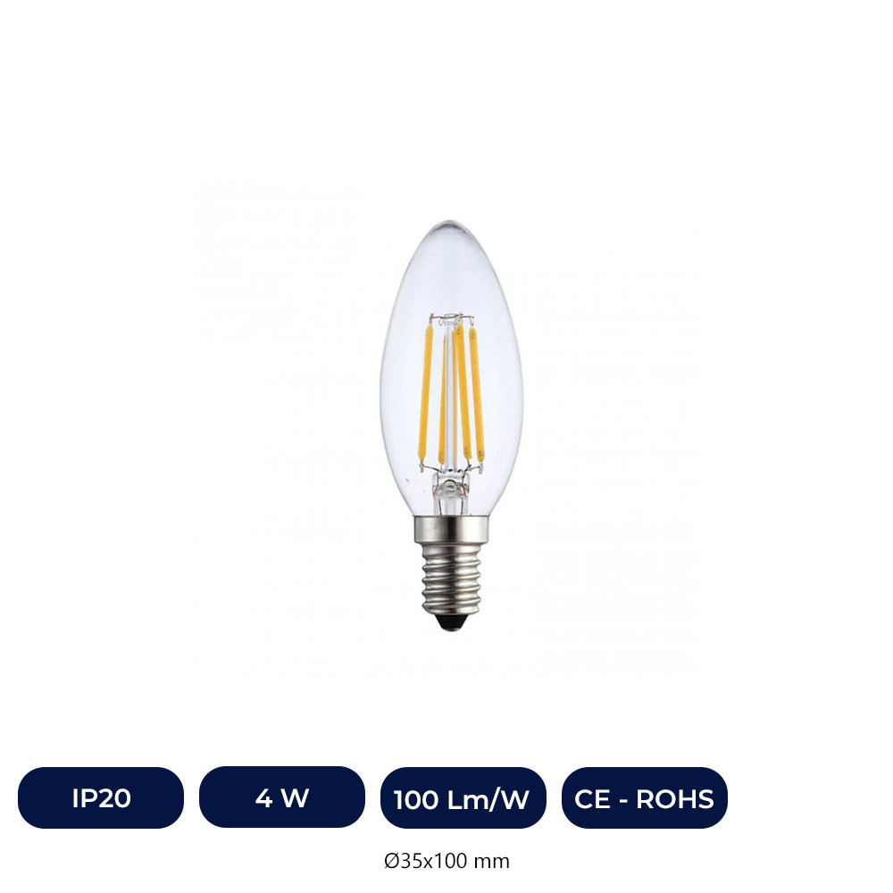 Notre Ampoule LED à Filament a une douille E14 et une puissance de 4W, ce qui nous offre une lumière chaude. Elle a également un rendement lumineux de 100lm/W.