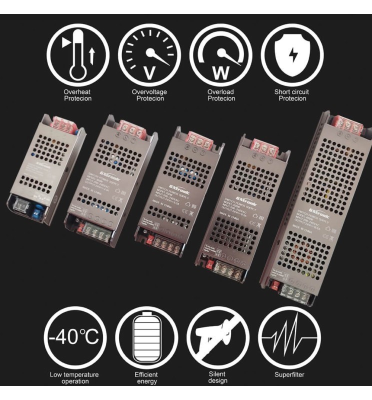 Découvrez l'alimentation pour bandes LED - 400W, 24Volts DC - le choix parfait, efficace et sûr ! Avec une tension continue constante, cette source à haut rendement assure une alimentation stable et fiable pour vos bandes LED. Sa conception intelligente permet un refroidissement par convection naturelle de l'air.