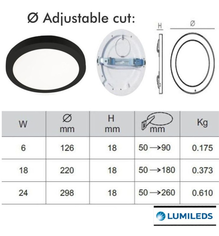 Vous rencontrez des problèmes car le trou est trop grand ou trop petit pour installer le downlight ou votre plafonnier LED ? La solution! Avec le nouveau modèle de Luminaire MOSS d'une puissance de 18W, DIAMÈTRE DE COUPE RÉGLABLE (Diamètre du trou de 50 mm à 180 mm) et couleur sélectionnable, vous n'aurez aucun problème à l'installer, puisqu'il s'adapte au diamètre du trou grâce au système de fixation coulissant . PROFITEZ DE VOTRE DOWNLIGHT + PLAFOND + CCT + RÉGLABLE MAINTENANT ! 6 OPTIONS DE PRODUITS EN UNE SEULE !
