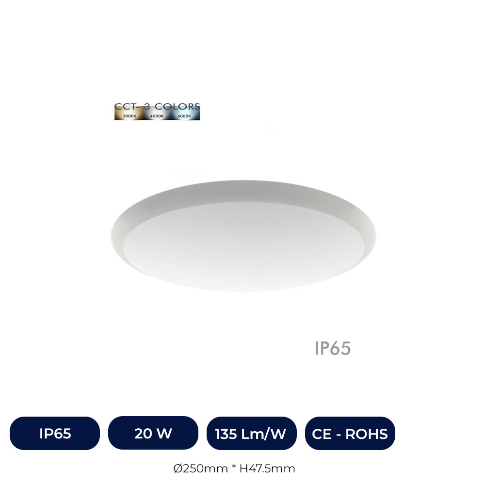 Découvrez le surprenant Plafonnier LED Surface - IP65, avec puissance sélectionnable 20W-16W-12W et CCT réglable 3000k-4000k-6000k. Fabriqué en polycarbonate résistant, diamètre 250mm, SMD2835 135 Lumens/W. Efficacité, style et durabilité en un seul produit. Illuminez vos espaces avec perfection !