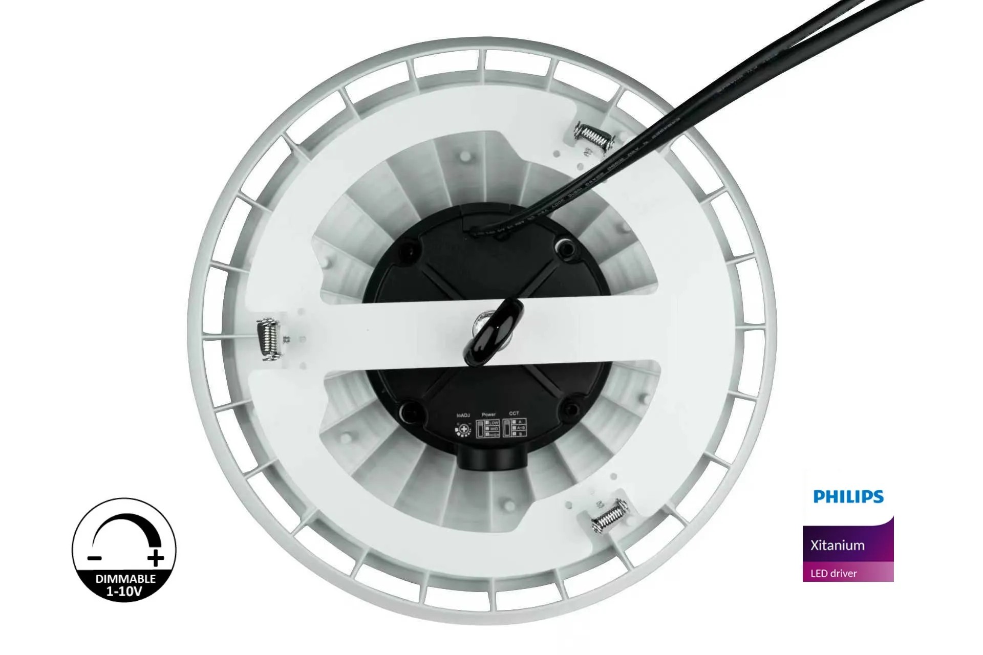 Le driver garantit une régulation précise de la lumière via protocole 1-10V, s’intègre aux systèmes d’éclairage standards et prolonge la durée de vie du produit.